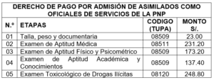 Se realiza por concepto de cuota de ingreso que comprende vestuario, equipos y materiales que son necesarios para el proceso de formación profesional policial, así como para garantizar que los estudiantes terminen el Plan de Estudios hasta su alta en la Policía Nacional del Perú.